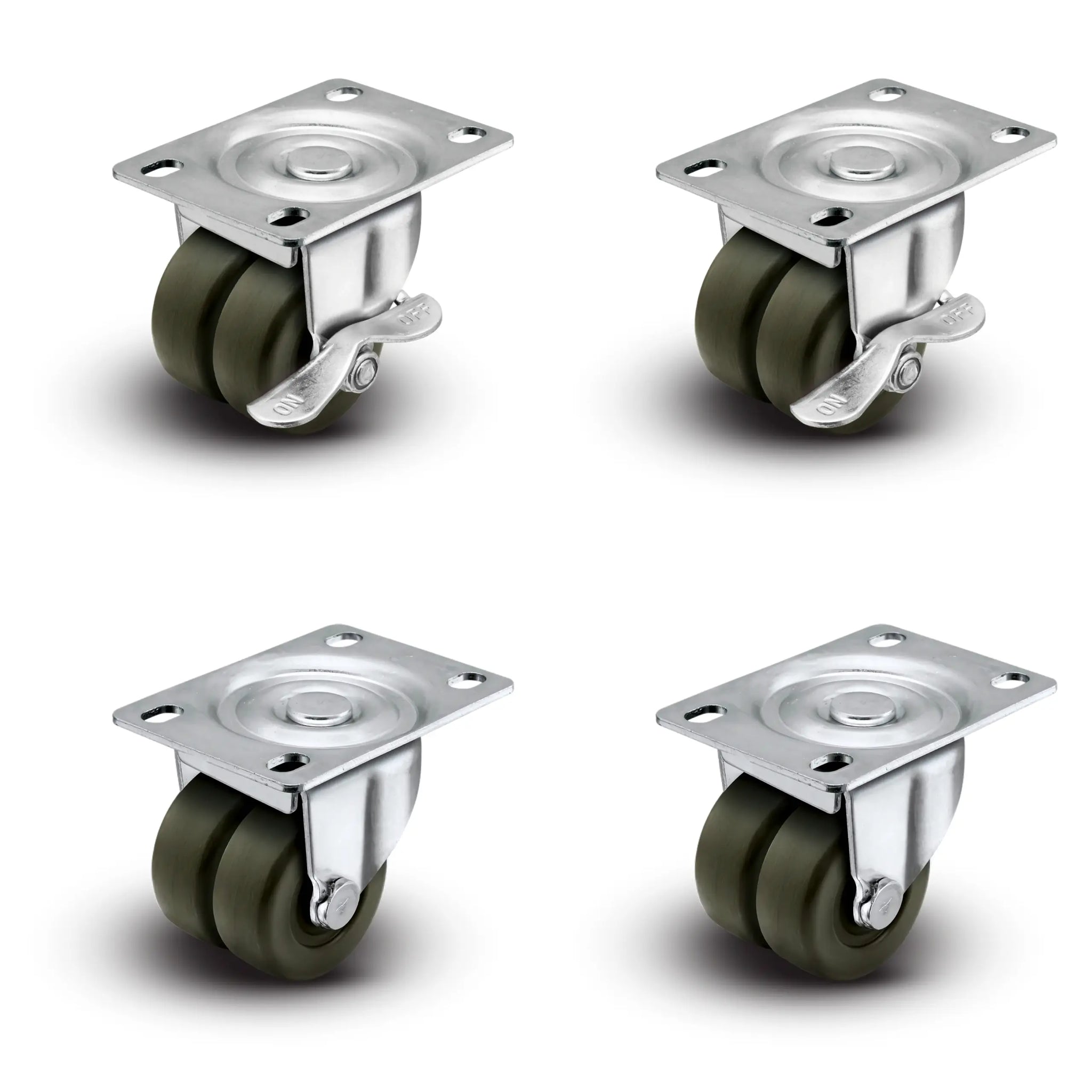 Premium 2" Low Profile Swivel Plate Casters -2 Plain Swivel & 2 With Brakes | Hard Rubber Dual Wheels | 225 lbs Capacity Each / 900 lbs Per Set of 4 | Smooth & Quiet Rolling | Heavy Duty Industrial Casters | Ideal for Furniture, Equipment, and More!