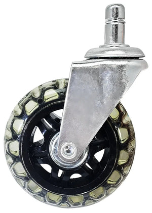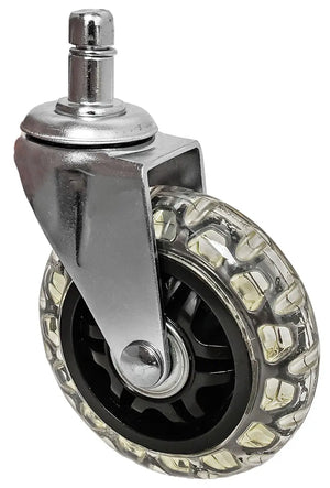 This listing is for a set of 5 high-quality Rollerblade Wheel Style Chair Casters. Each Chair Caster holds 150 lbs for a whopping overall weight capacity of 750 lbs for this set of 5 casters. These wheels are made of a sleek-looking transparent polyurethane material which is completely non-marking and easy to roll on tile, wood, and carpet. These are the most affordable chair casters on the market for the rollerblade style as shown in the photos. Add some style to your office chairs today with our rollerblade office chair casters!