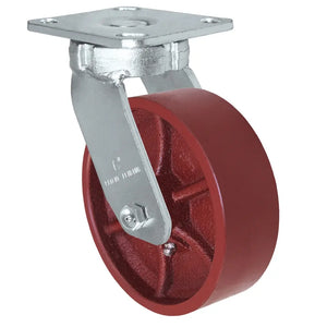 This listing is for a 6-inch diameter by a 2-inch tread width kingpinless Swivel Caster combined with a heavy-duty ductile iron wheel. Kingpinless Casters offer exceptional maneuverability and prevent kingpin failures commonly seen on standard casters due to severe shock loading. The top plate and inner raceway are integrally forged construction, and the caster is precision machined and induction hardened with a sealed raceway which provides exceptionally smooth performance. The legs are double welded, and the swivel ball bearings are 3/8" Diameter HRC45 steel which absorbs thrust and load in severe environments. The steel is made from ASTM 1045 Hot Forged Steel. Ductile Iron Wheels offer a 70,000 PSI tensile strength for heavy impact and shock load applications. These wheels should never be dropped on the floor as they are incredibly heavy-duty and can damage concrete. The swivels and Rigids both contain an 8MM thick steel construction which is thicker than any standard top plate caster of this size.