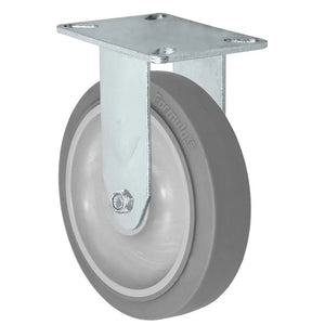 CasterHQ's 4 inch Gray Non-Marking TPR Wheel comes assembled in a Stainless Steel Grade S304 Rigid Caster Yoke. Our Wheel is made from a proprietary Thermo Plastic Rubber compound molded to a polyolefin core. These wheels are known as the FX Formula XS Rubber Wheel. Our wheels are specially engineered to withstand harsh chemical environments and are resistant to greases, blood, oils, brine, solvents, and water including wash down applications. Our FX Formula XS Rubber Wheels are completely non-marking, quiet to roll, and soft to roll over obstacles and debris with ease. FX Formula Wheels come with Precision Ball Bearings which is a huge upgrade from most wheels with a plain bore. Precision Bearings help the caster roll easier and quieter while providing a very smooth ride. We've also upgraded these with small thread guards to protect the bearings from dust, debris, hair, and threads from accumulating between the axle and bearing to allow these casters and wheels a much longer lifespan than the competition. These wheels perform great on floors that contain metal shavings, gravel, dirt, and/or debris. We designed these to never flat spot which means you can leave your equipment or cart sitting on these wheels for longer periods of time and the wheel tread will remain resilient and always perform like new. These wheels are commonly seen on high-end furniture dollies, carts, dolly cart casters, food service cart casters, material handling cart casters, maintenance cart casters, stocking cart casters, clean room cart casters, computer cart casters, laboratory cart casters, medical cart casters, computer rack casters, and many institutional cart casters as well as clean room operations. These wheels are made to outperform and outlast the competition. The Stainless Steel Rigid Caster Yokes contains Heavy Gauge Cold Rolled Steel S304 Stainless Steel construction for extra durability and we finish them off with a S304 Stainless Coating for complete rust resistance when exposed to wet and corrosive environments.
