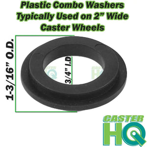 Our Plastic Combo washers are Flanged washers that are located between the Caster Wheels outer hub of each side of the wheel. Combo washers hold the roller bearing inside the bore of the wheel. Flanged Combo Washers also support the axial-load or side-to-side motion on a shaft and help to prevent movement along that shaft. The thrust washer provides a surface on which a roller bearing is typically supported in the Caster industry. Have more questions about our Thrust Washers? Give us a call at 1-844-439-4335 Monday thru Friday between 8 am-5 pm (CST) or email us at info@casterhq.com
