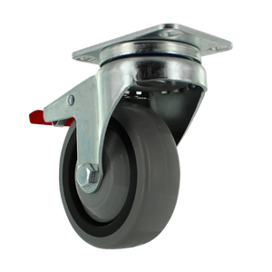 Introducing CasterHQ's Industrial Swivel Total Locking Caster With Zinc Plated Steel with a Lacquer Dip Yoke, 2 3/8″ X 3 5/8″ Plate Mount, 4″ X 1 1/4″ TPR A70 Crown Tread Gray on Black Wheel, 3/8″ Dual Precision Bearing with 3/8″ Axle and Nylon Lock Nut. With a Total Lock Brake. These Casters can be used for many applications and industries including backroom, industrial, institutional, janitorial, food service, and Material Handling.