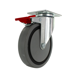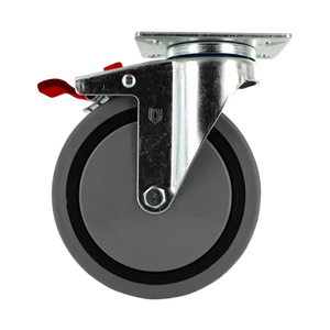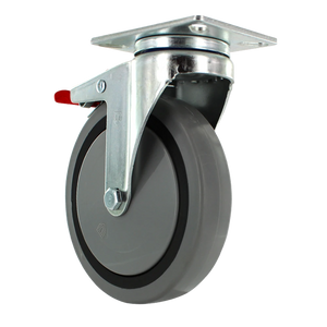 Introducing CasterHQ's Industrial Swivel Total Locking Caster With Zinc Plated Steel with a Lacquer Dip Yoke, 2-3/8" x 3-5/8" Plate Mount, 5″ X 1 1/4″ TPR A70 Crown Tread Gray on Black Wheel, 3/8″ Dual Precision Bearing with 3/8″ Axle and Nylon Lock Nut. With a Total Lock Brake. These Casters can be used for many applications and industries including backroom, industrial, institutional, janitorial, food service, and Material Handling.