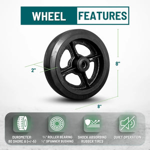 Mold-on rubber wheels provide excellent shock absorption, reduce noise, and roll smoothly compared to harder wheels like polyurethane or steel.