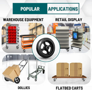 This caster is ideal for carts, dollies, racks, trucks, and material handling equipment in industries like warehousing, hospitality, food service, and retail displays.