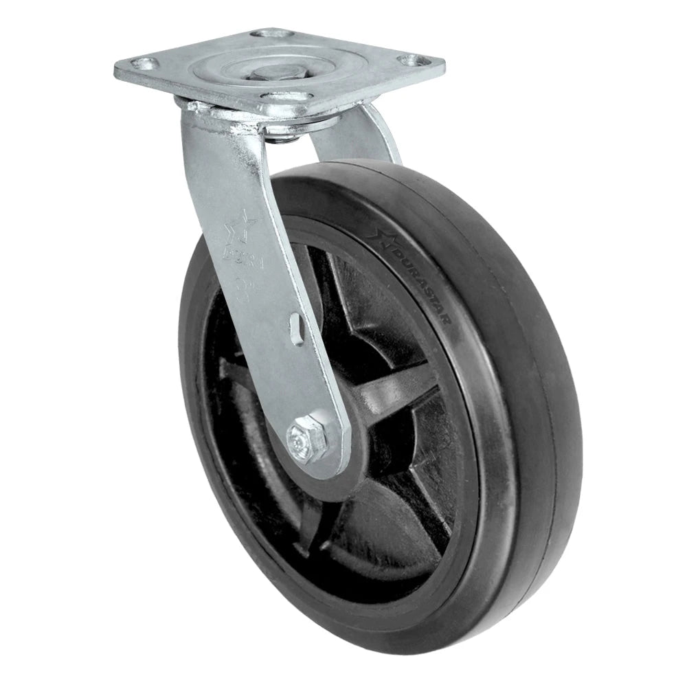 Invest in the Durastar Medium Heavy Duty 30 Series 8" x 2" Rubber on Glass-filled Nylon Swivel Caster to experience the perfect blend of strength, durability, and customizable performance, designed to elevate your operational efficiency in even the most demanding work environments.